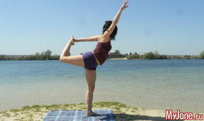 Вместе с тем, существует вариант выполнения Натараджасаны, лежа на боку. Для этого действуйте в следующей последовательности: