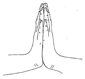 Техника выполнения: медленно сложите ладони вместе, наблюдайте потоки энергии через ладошки. Если мы приветствуем кого-то, то сложите руки на груди на уровне сердца ладошка к ладошке.