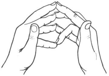 Соединить пятый палец левой руки с четвертым правым. А пятым пальцем правой руки коснуться четвертого левой. Разом сомкнуть правый третий палец с левым вторым, а третий палец левой кисти с правым вторым. Первые пальцы расставить.