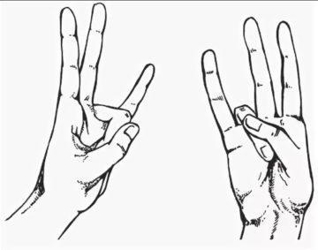 Четвертый палец прикасается к началу первого, который накрывает его так, что место их соединения приходится на подушечку первого пальца. Другие пальцы выпрямлены в расслабленном состоянии. Смотрите на фото.