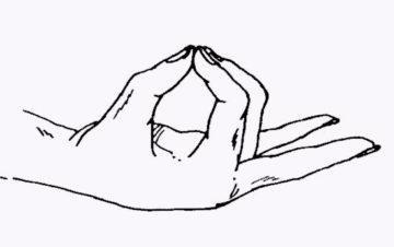 Участвуют обе руки по отдельности. Нужно соединить три пальца подушечками между собой: указательный, безымянный и большой. Не участвующие в позе пальцы можно расслабить и распрямить.
