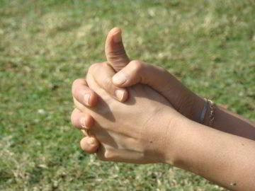 Большой палец одной из рук выставить в вертикальное положение таким образом, чтобы он располагался внутри кольца между указательным и большим пальцем (смотреть фотографию).