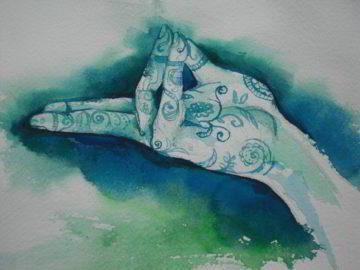 Большой, безымянный палец и мизинец соприкасаются кончиками, а другие просто выпрямлены.