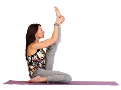 Если упражнение кажется слишком сложным, его можно облегчить следующим образом: захватить ладонями не стопу, а щиколотку. Такой прием снизит мышечную напряженность и позволит удерживать ногу в прямом положении.