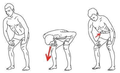 Занять позу Рыбака: встать прямо, ноги расставить на ширину плеч, немного согнуть в коленных суставах. Наклониться вперед, делая упор руками на ноги (выше колен).