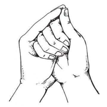 Большой палец левой руки обхватывают четырьмя пальцами правой руки.