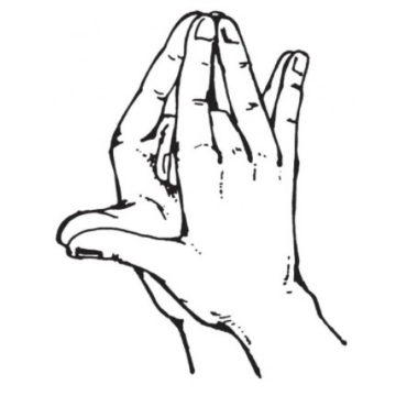 Техника. Выполнять двумя руками. Подушечками третьих пальцев коснуться ладоней, сомкнуть над ними прямые вторые и четвертые. Они будут «крышей храма». Сомкнутые друг с другом прямые первые пальцы олицетворяют голову дракона, а соединенные между собой выпрямленные пятые – хвост дракона.